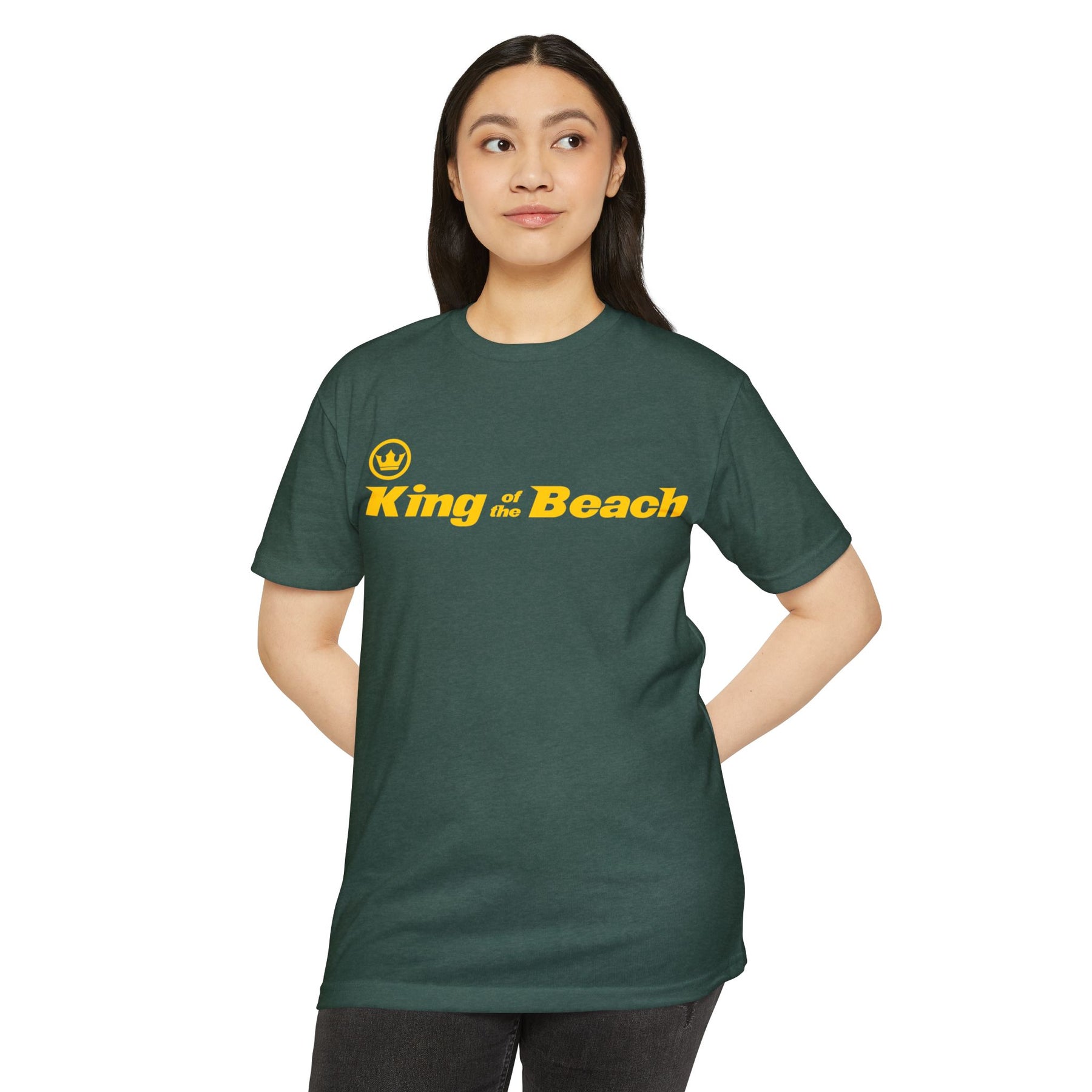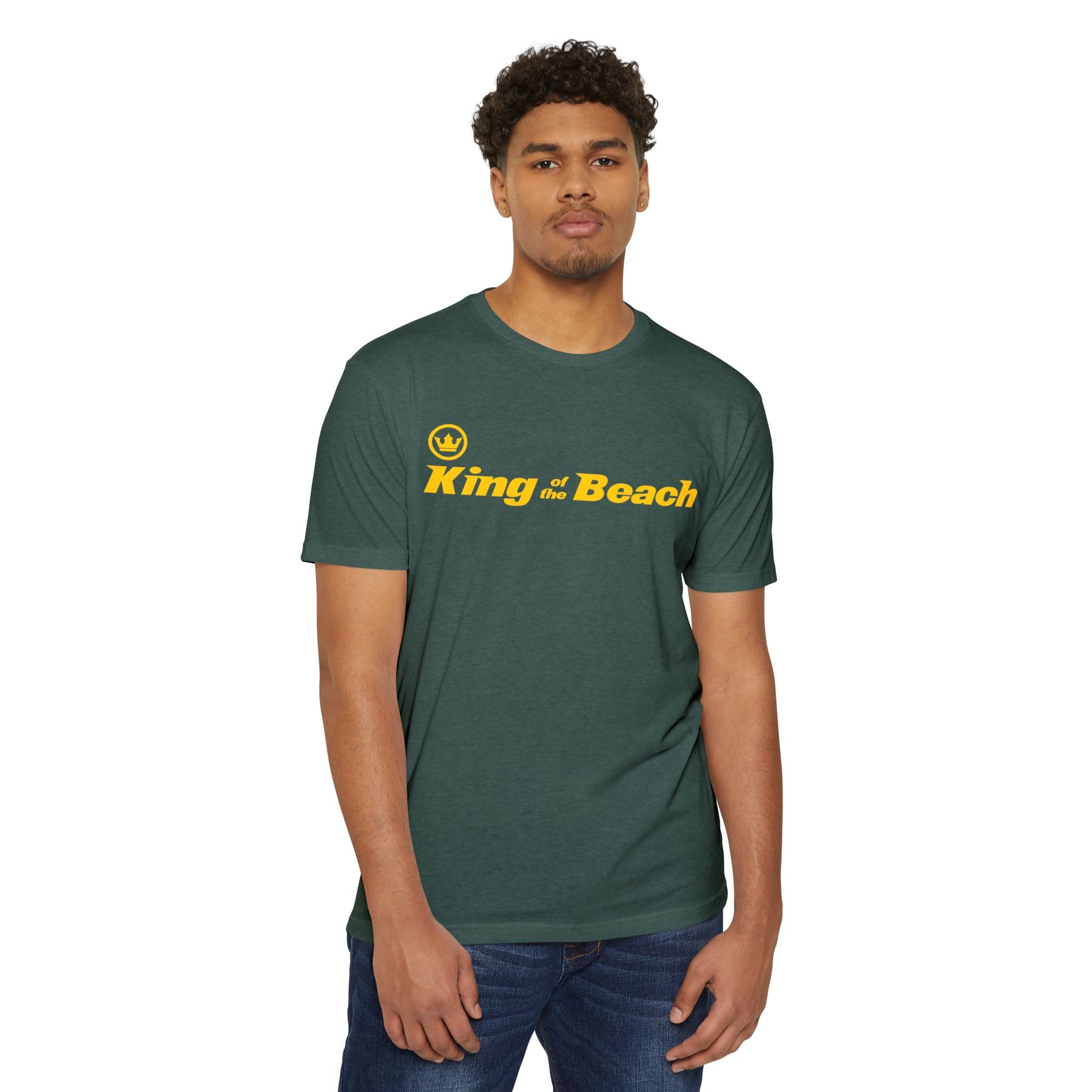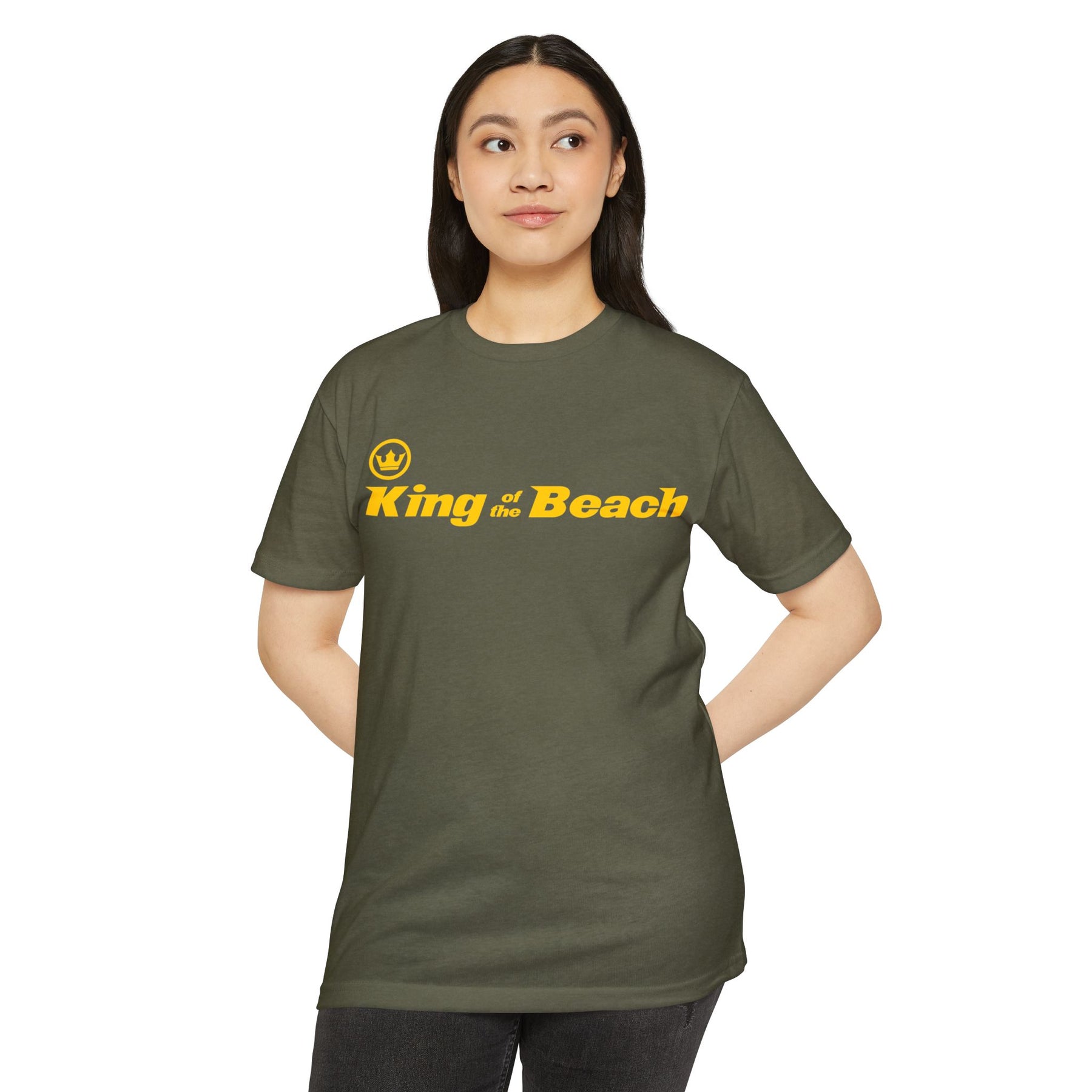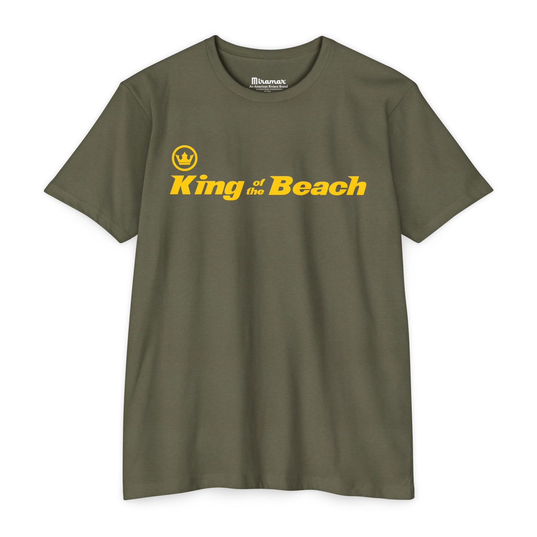 Lightweight and laid-back, this classic-fit tee carries a sunny, beachside attitude. The olive canvas and bold golden “King of the Beach” print read like a sunset memory—warm, easy, and a little cheeky. Slip it on for slow afternoons by the boardwalk or for friendly backyard games; the soft, combed-ring spun cotton blend drapes comfortably and moves with you. It settles in like an old favorite: breathable on hot days, smooth against the skin, and durable enough for repeated wear. The straightforward silhouette and ribbed collar keep things simple while the tear-away label and clean interior finish make it itch-free and ready to live in.